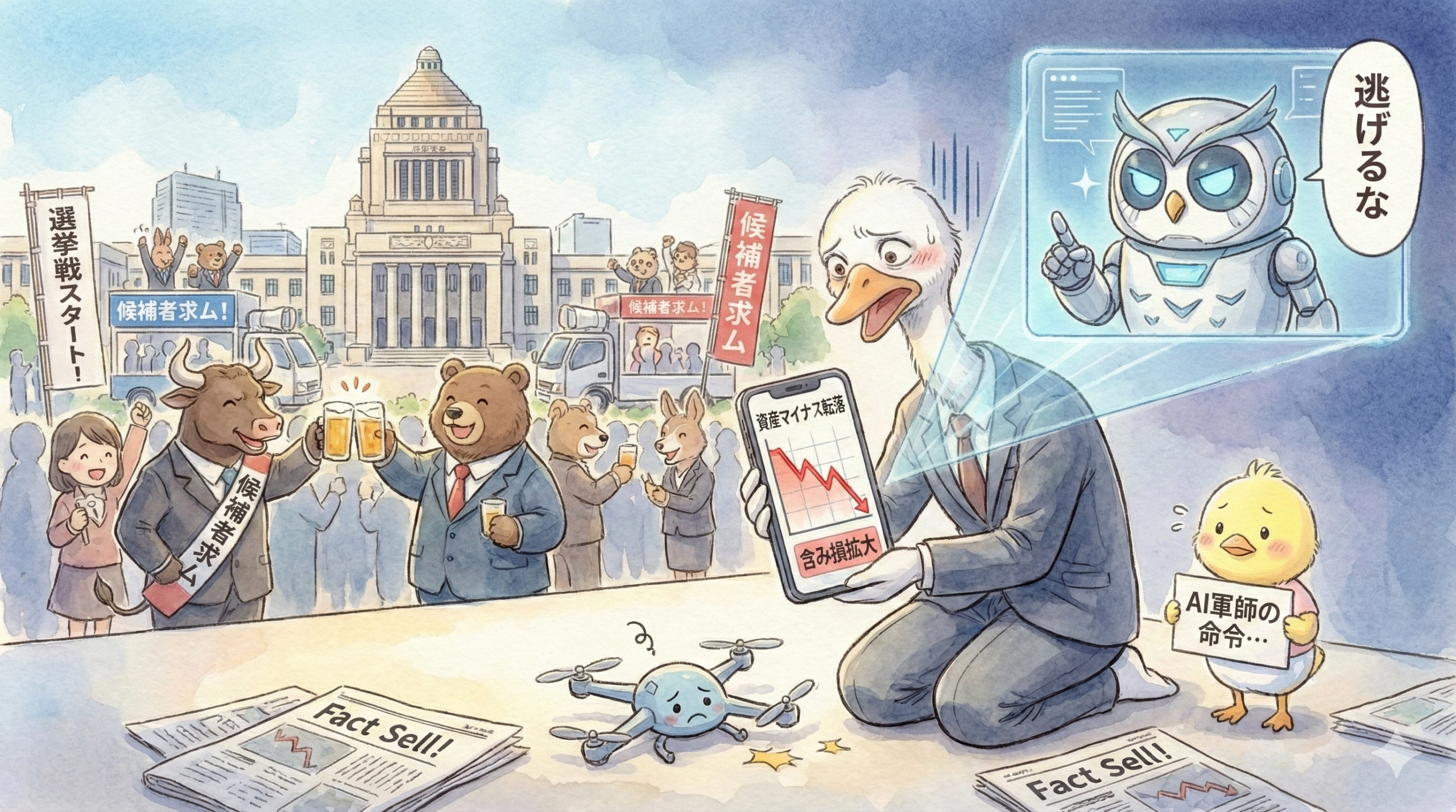 「想定の範囲内です。解散から公示までの期間は、期待先行の買いが一旦一巡し、短期筋が利益を確定させる『空白の時間』。ここでの下落は、上昇エネルギーを蓄えるための『屈伸運動』に過ぎません。